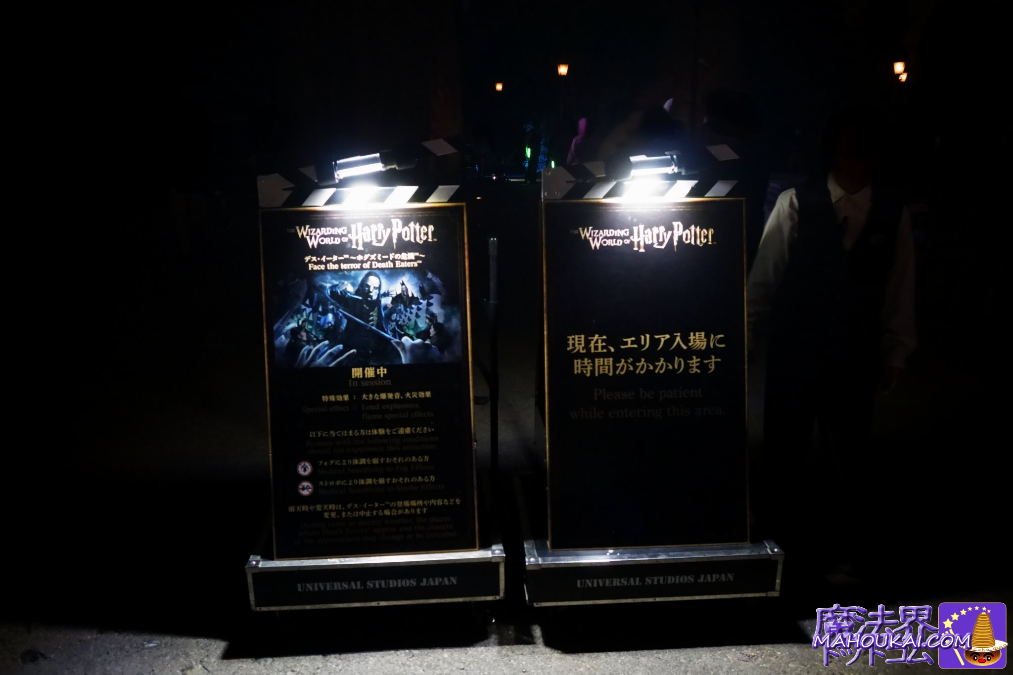 デス・イーターが登場する18時頃からはハリポタエリア内も混雑します。混雑状況によりハリポタエリア入口(ストーンゲートウェイ)には「入場に時間がかかります」看板が設置され、一般ゲストは整理券入場口(右側)へ案内されます。