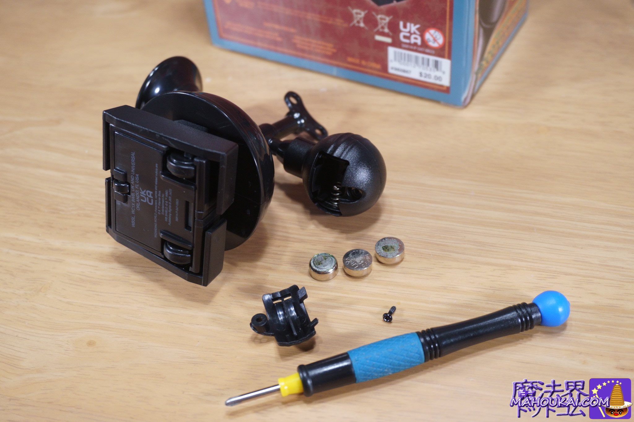 ラッパ(エアーホーン)の球体ポンプ部分にはボタン電池ケースの蓋が見えます。マイクロドライバーか小型プラスドライバーでネジを1本外し、蓋のネジ側から浮かして取り外せます。若干かたいので、外すのが難しいです。