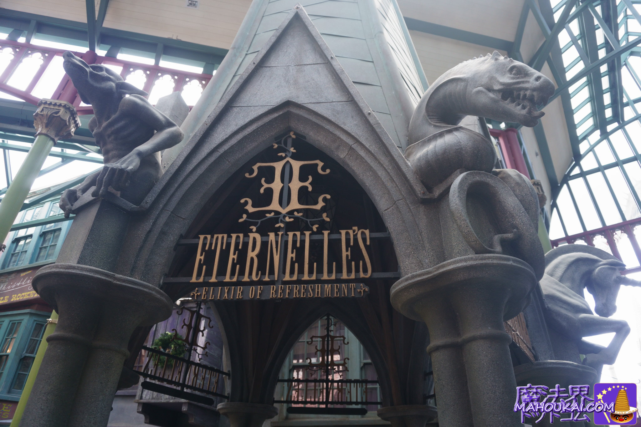 お店「Eternelle’s Elixir of Refreshment|エテルネルのリフレッシュ エリクサ」はオーランドのハリー・ポッターエリア「ダイアゴン横丁」エリアにあるホリゾント横丁にある屋台です。屋根が超尖がった建物です。