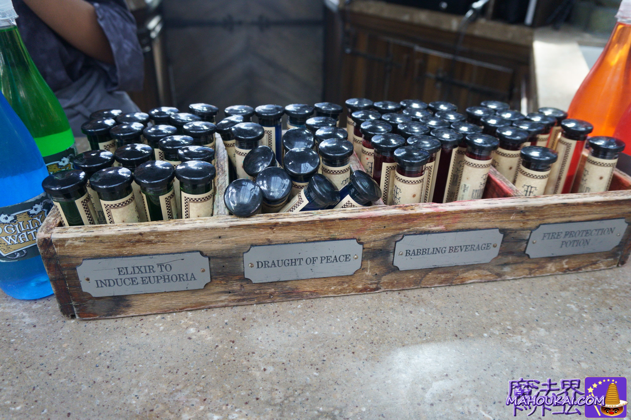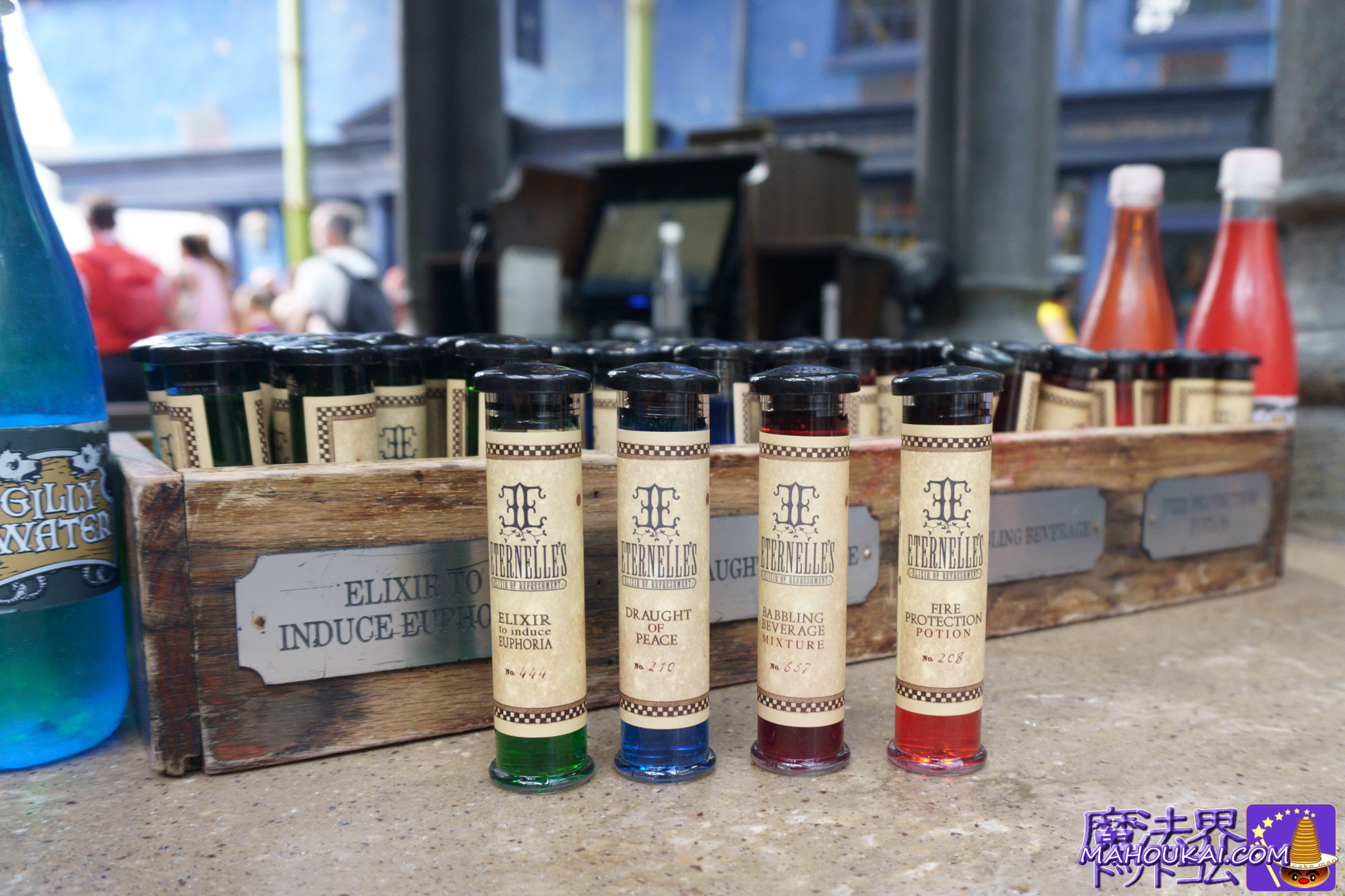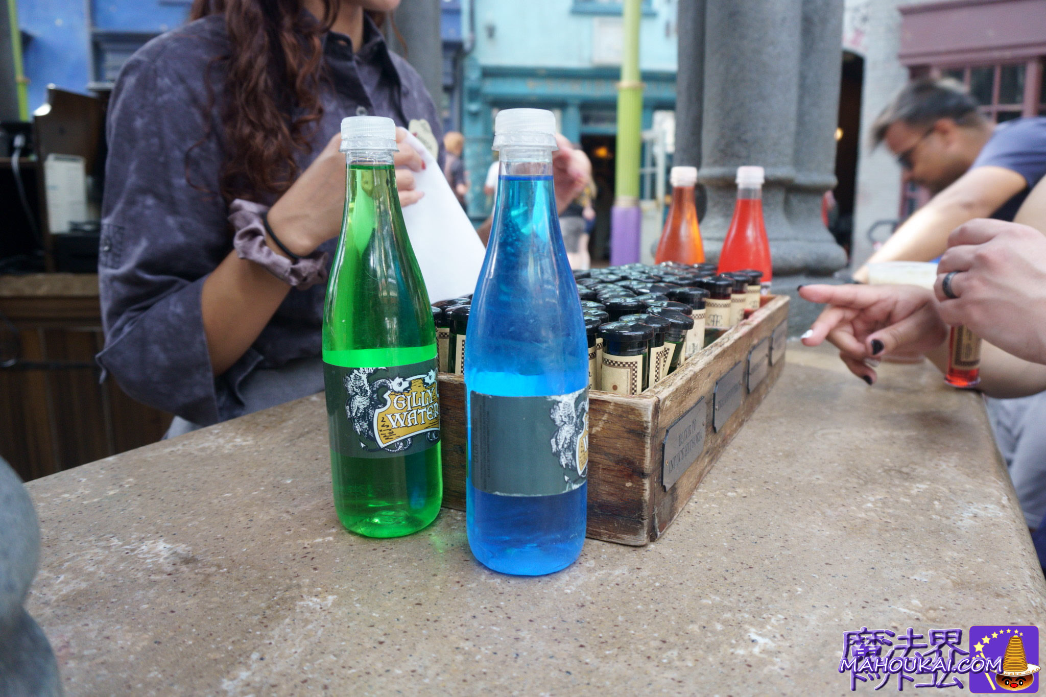 ダイアゴン横丁には4色の魔法薬瓶とギリーウォーター(魔法界の水)が売られています。