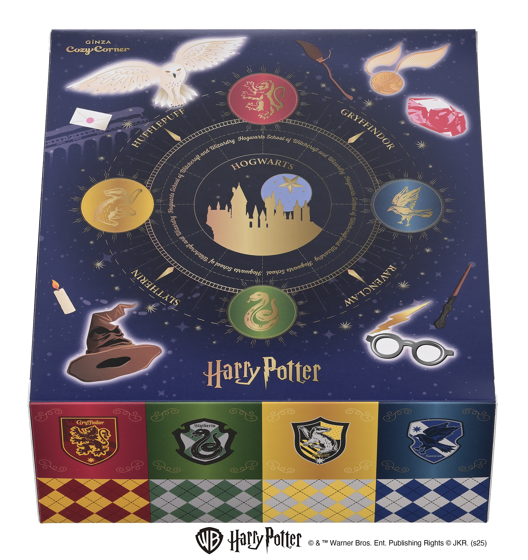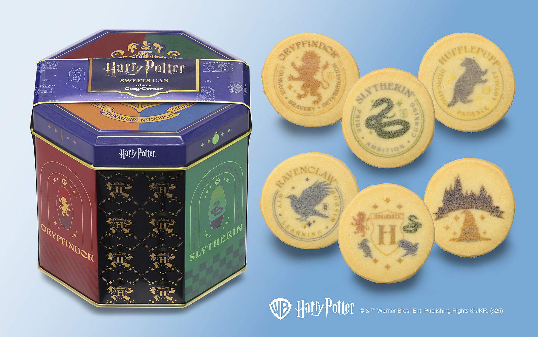 特長:ハリー・ポッターが通うホグワーツ魔法魔術学校にある4つの寮をデザインしたスイーツ缶です。寮の紋章や「組分け帽子」など、物語に登場するアイテムをプリントしたクッキーをアソートしました。