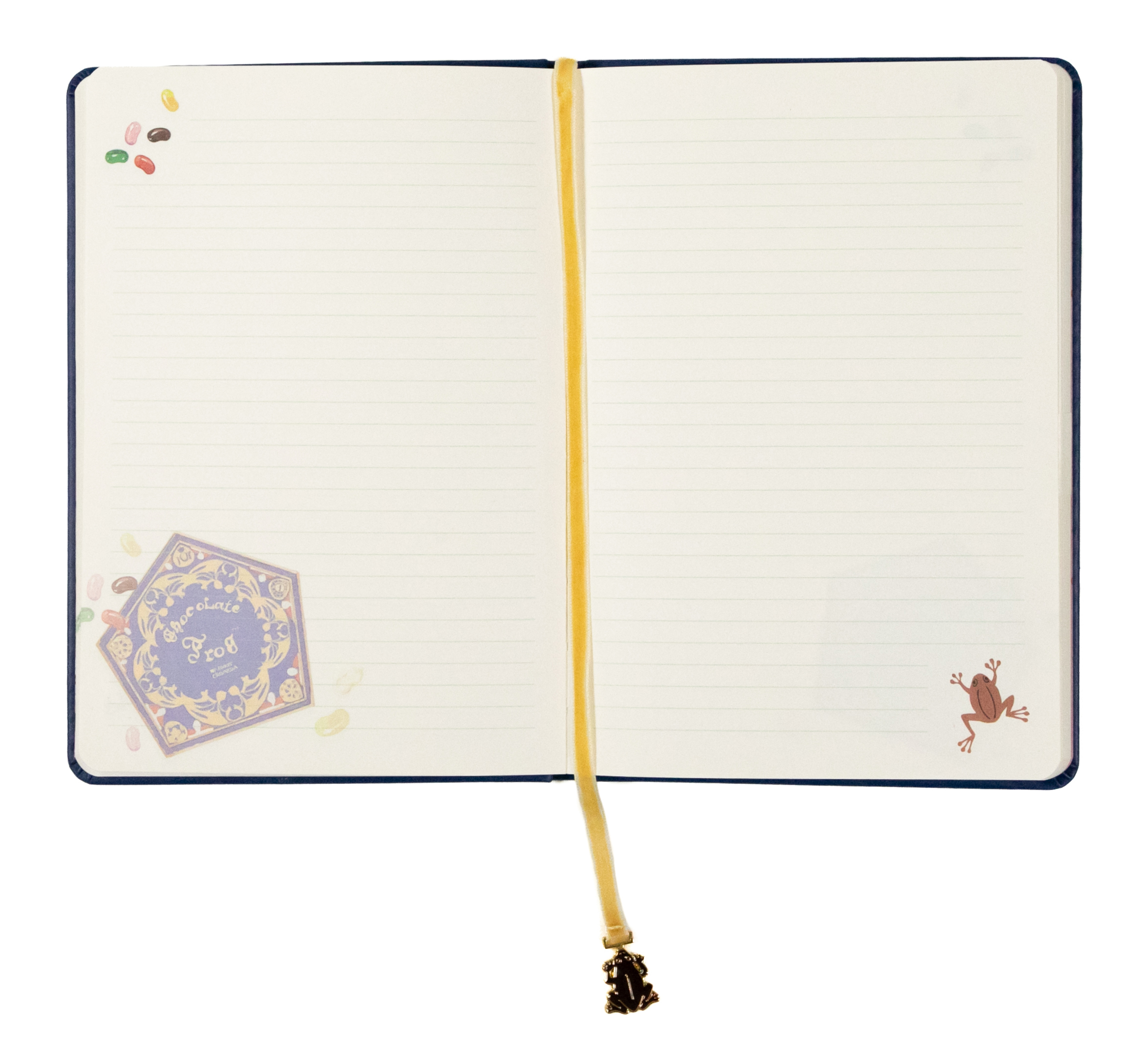 ノート部分はオールカラーで、カエルチョコレートやバーティー・ボッツの百味ビーンズなどハニーデュークスのお菓子があしらわれています。罫線入りのページになっており、日記や雑記、レシピノートなどさまざまなメモや記録を記すのにぴったりです。