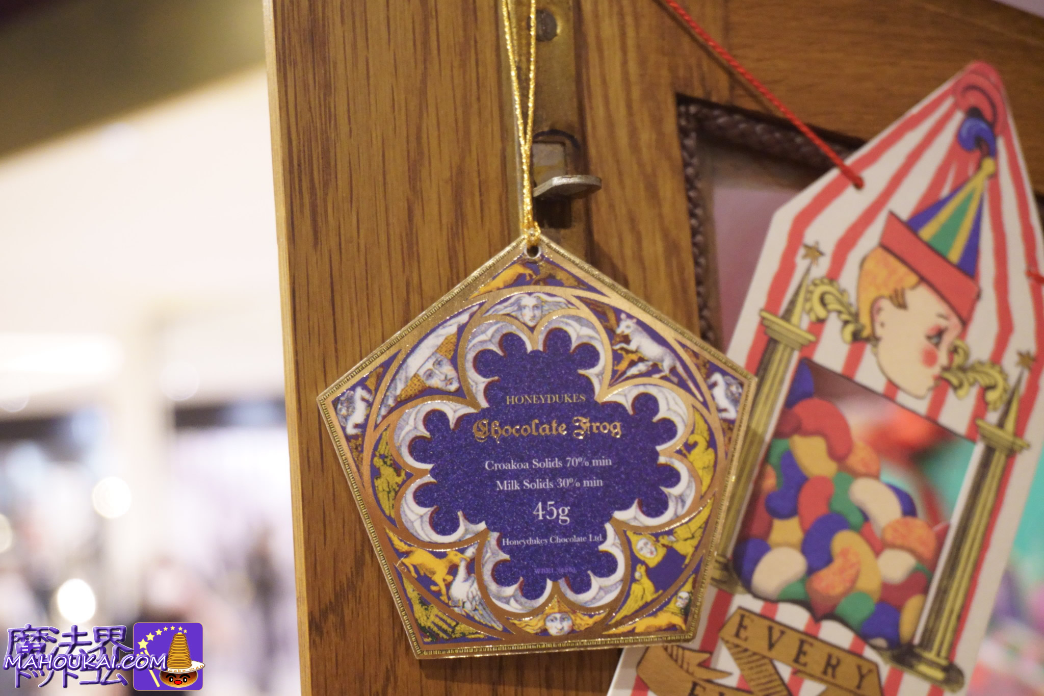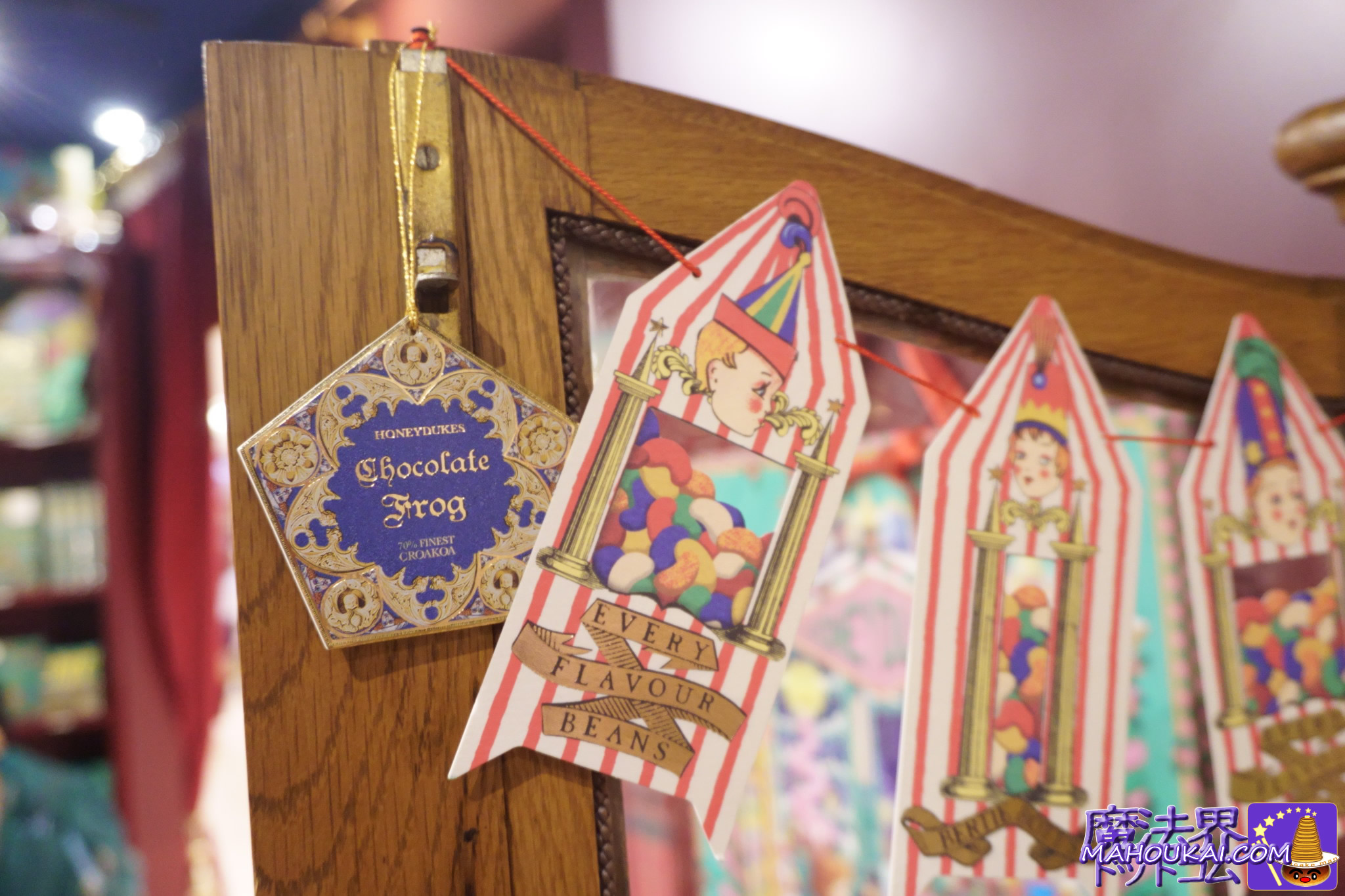 ハニーデュークスのお店ロゴの飾り、蛙チョコレートのパッケージの飾りです。蛙チョコのパッケージは表裏でデザインが異なるこだわりも♪