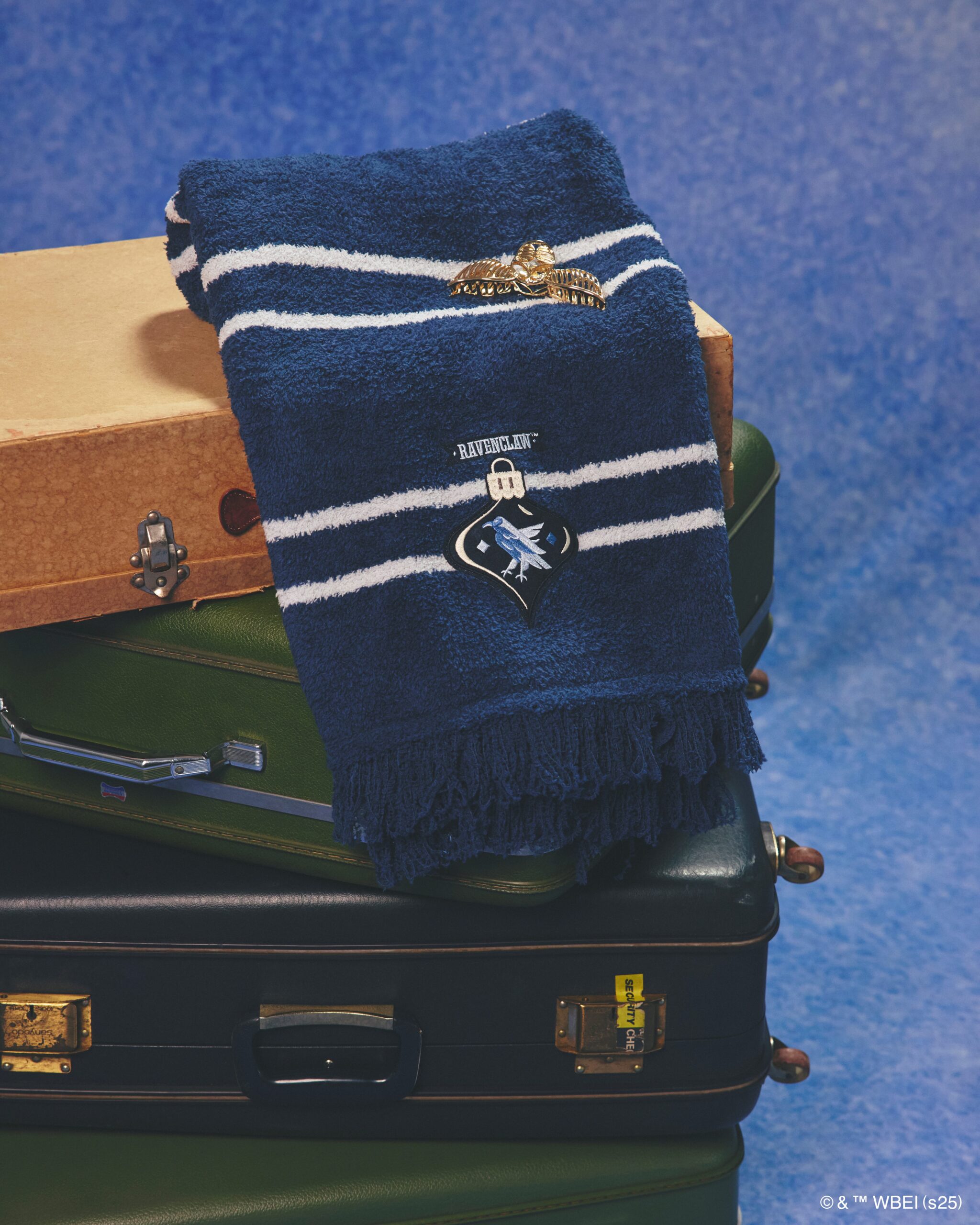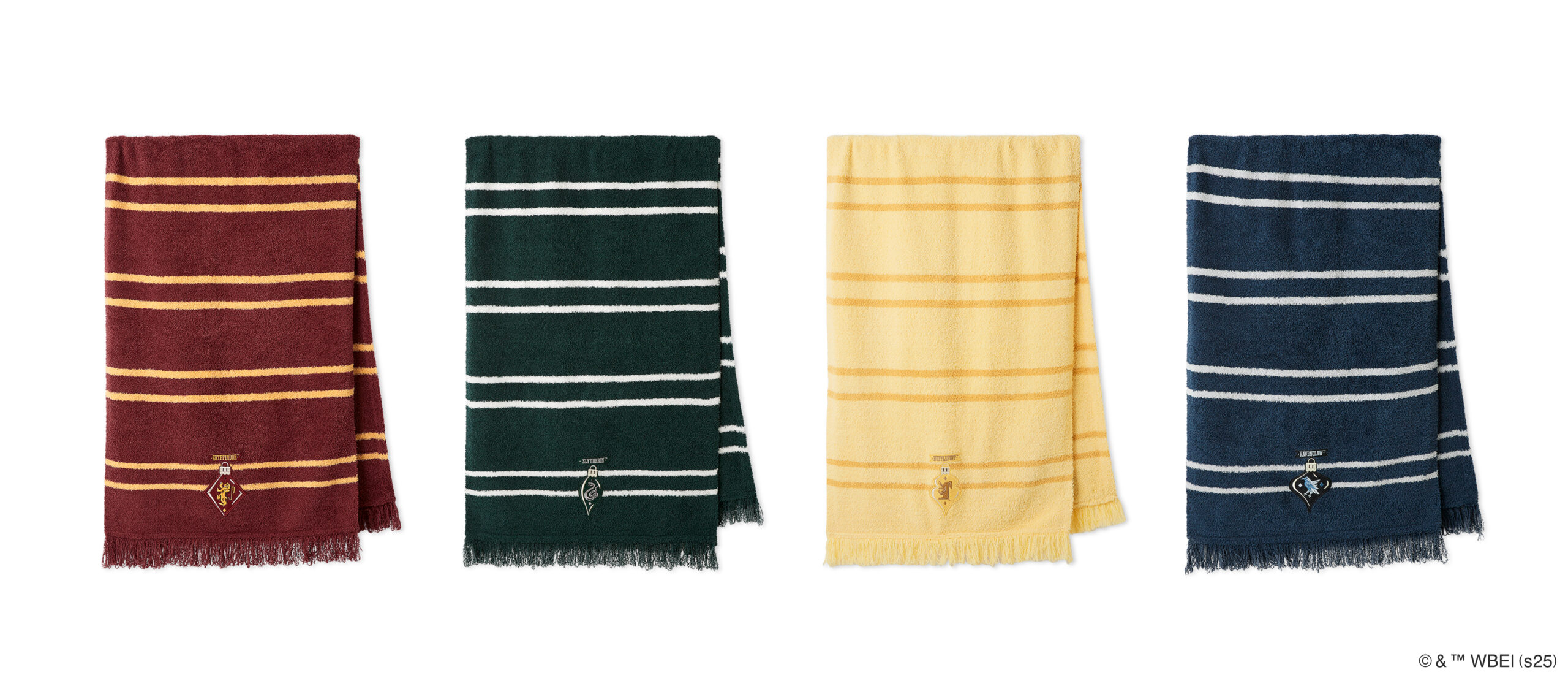 各寮のシンボルをワッペンでデザインしたフリンジ付きのボーダーブランケット。