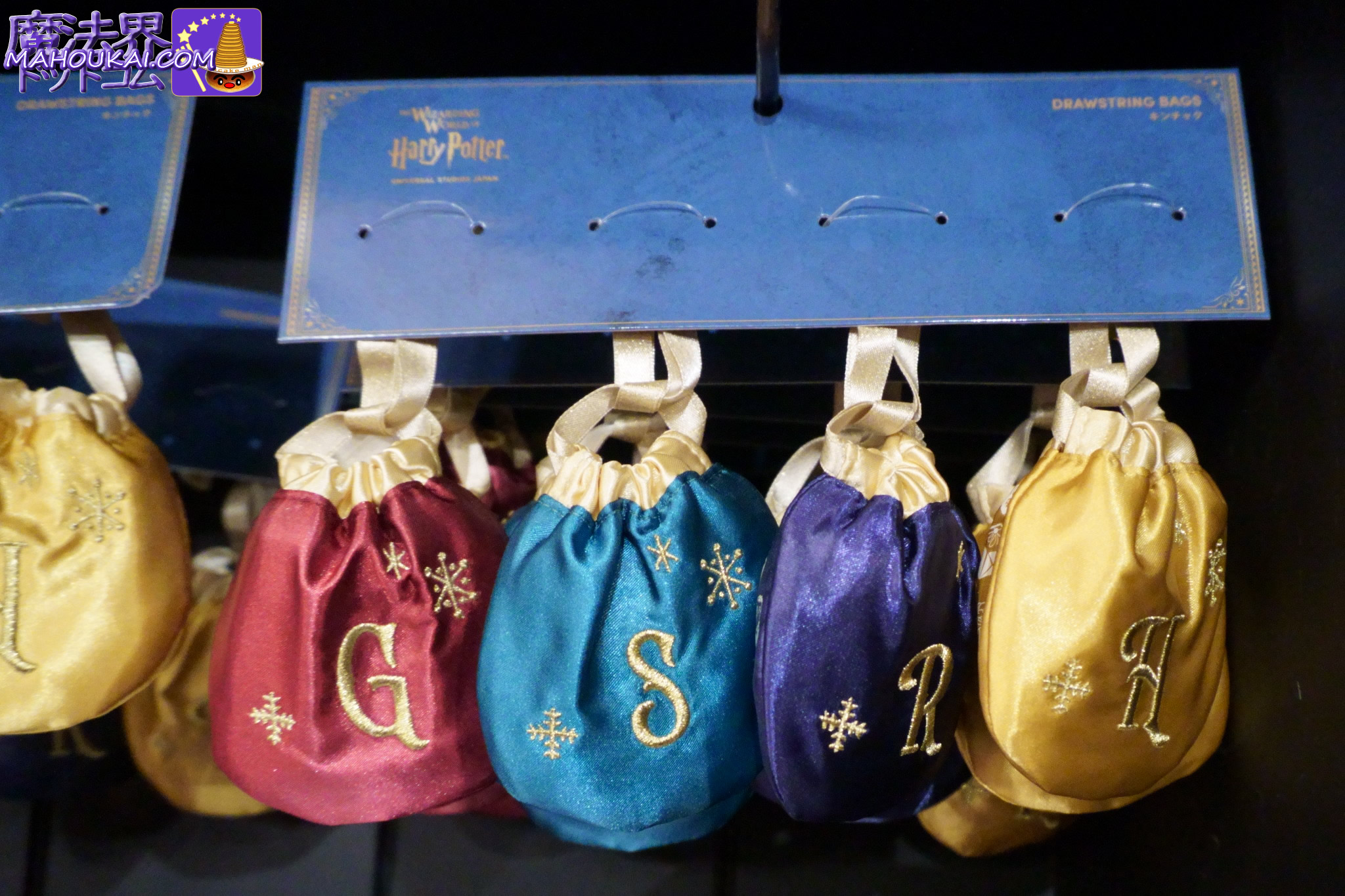 ホグワーツ4寮カラーの巾着袋のセットです。寮名のイニシャルが入っています。