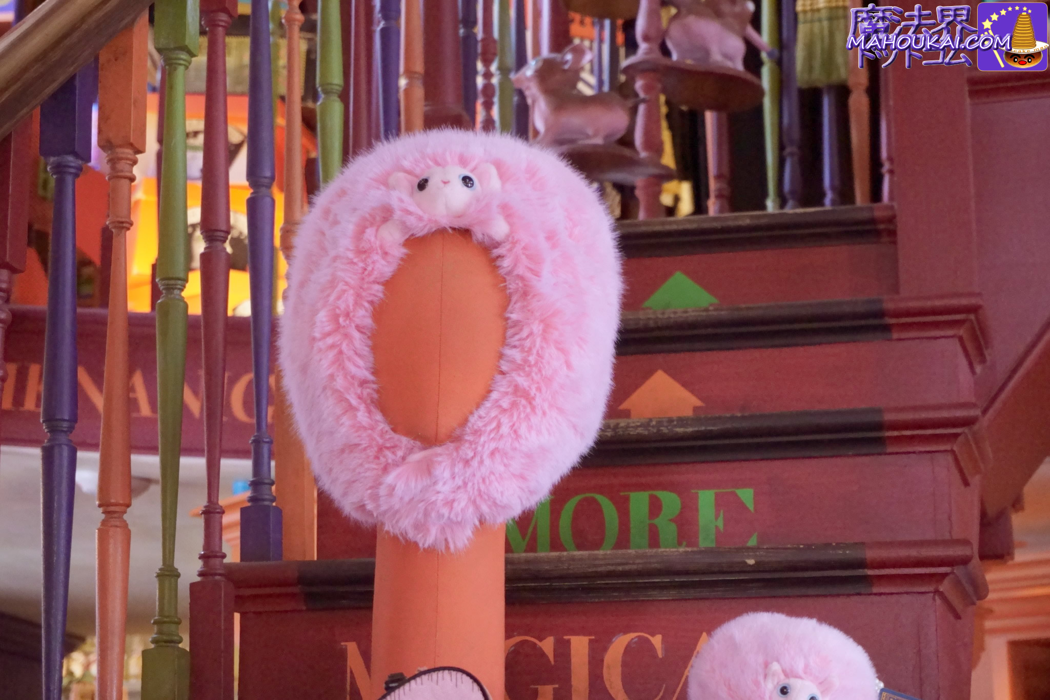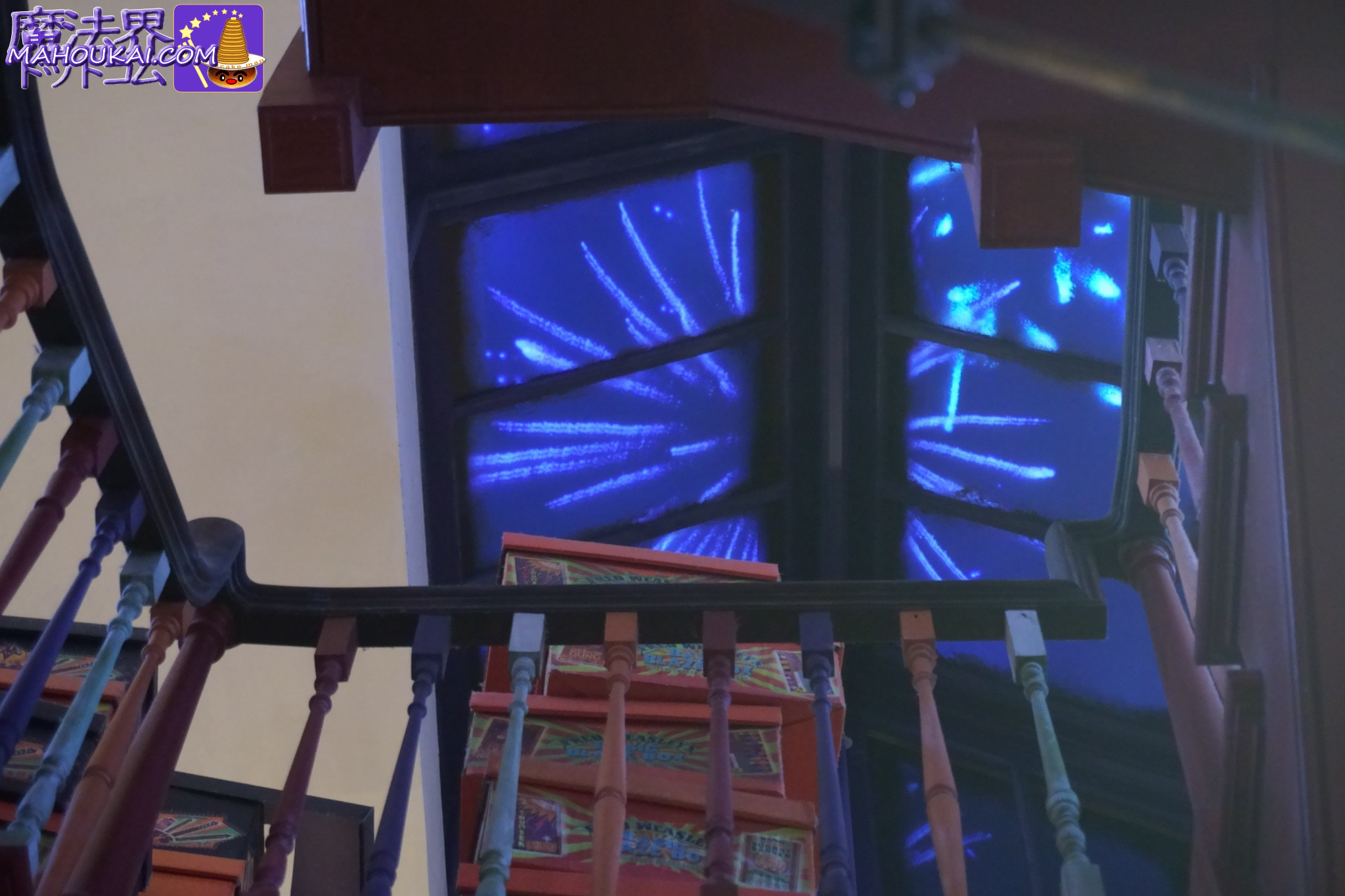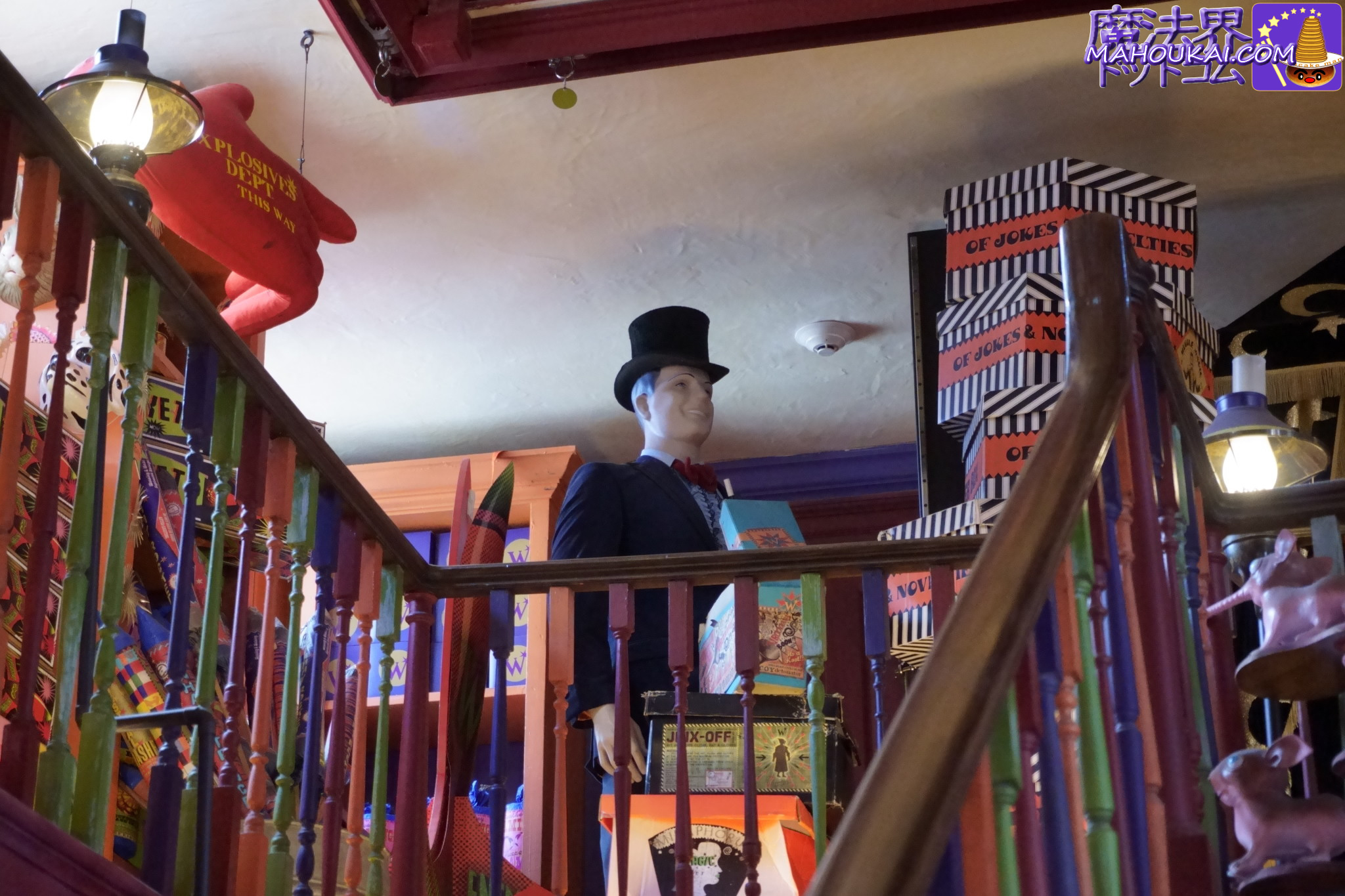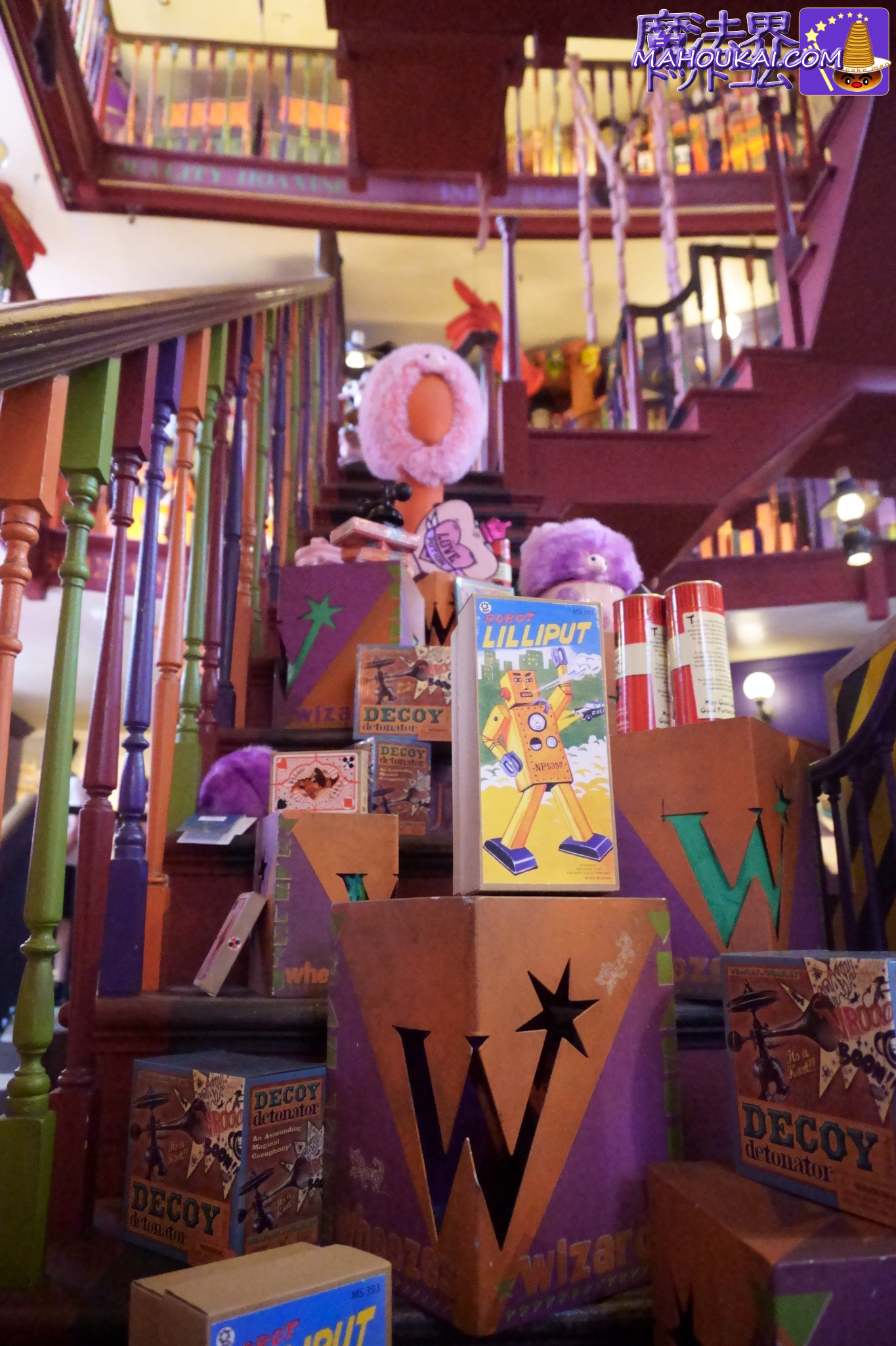 2階へ上がる階段です。実際にあがることは叶いませんが、ウィーズリー&ウィーズリー製品がずらりと並んでいます。展示物と実際の販売グッズと混在しているので、欲しい!と思ったら、展示品かどうか確認しましょう。