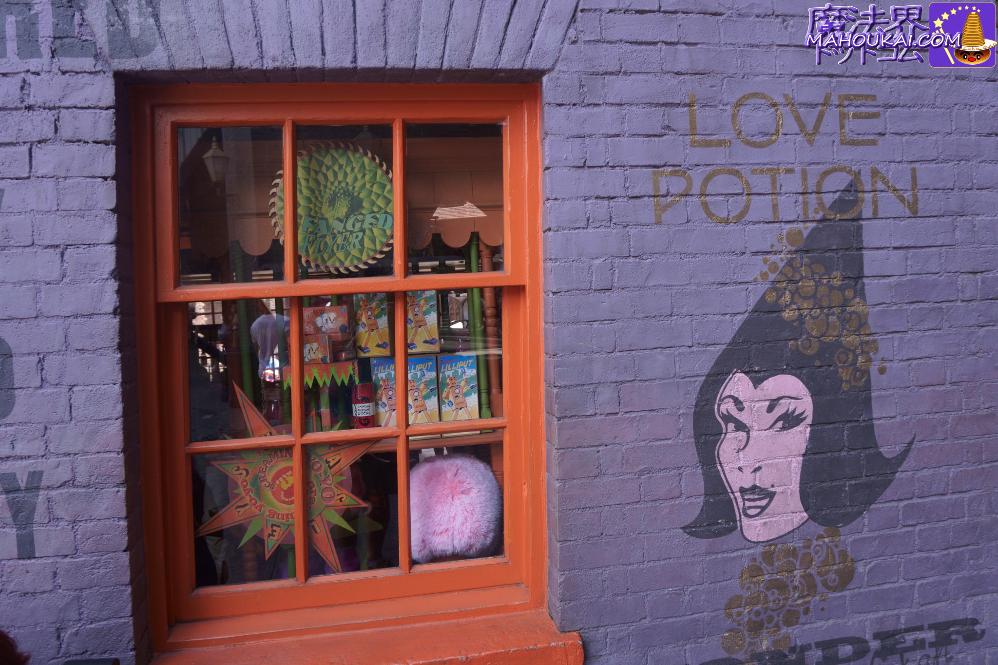 出窓には噛みつきフリスビー(巨大!)と噛みつきヨーヨーやビッグなピグミーパフの後ろ姿が!壁にはラブ・ポーションのロゴとイラスト。